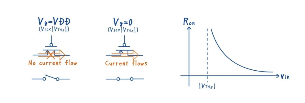 pMOS スイッチは,nMOS の“逆”のふるまいを示す素子です.下図に示すように,ゲート電圧が VDD のときはオフとなり,0V を与えるとオンになります.オン抵抗 \(R_{\text{on}}\) の式そのものは nMOS と同じ形をしており,