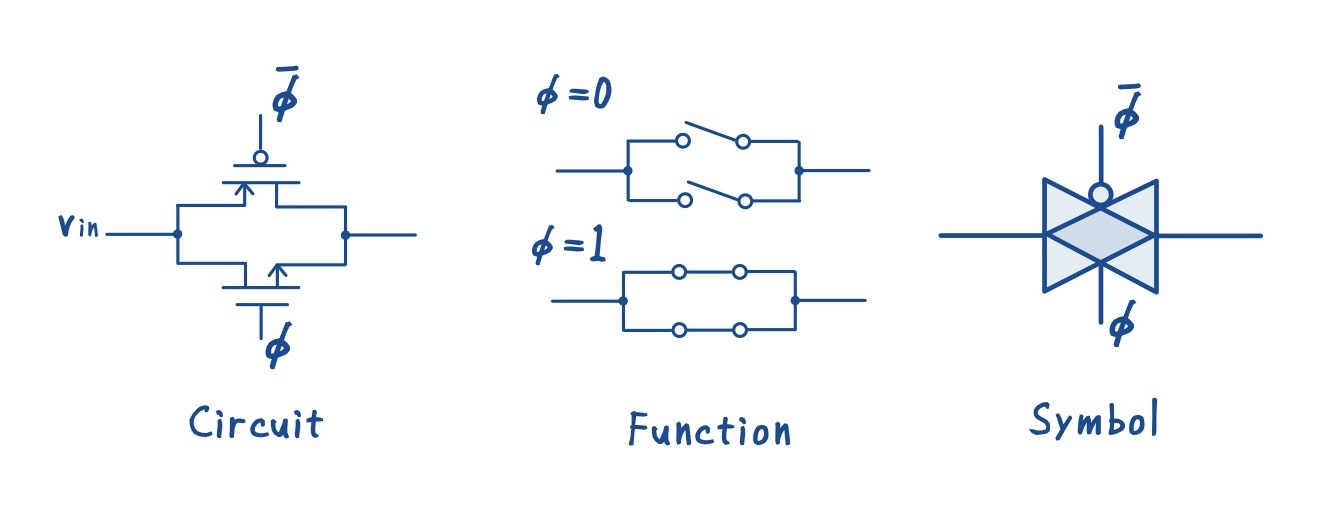 動作概要としては,nMOS 側にはクロック,pMOS 側にはその反転クロックを与えて制御することで,両トランジスタが同時にオン・オフするように動作します.この構成によって,nMOS は低電圧側で,pMOS は高電圧側でよく導通するという両者の特性をうまく組み合わせることができ,入力電圧の 0〜VDD の全レンジをカバーできます.