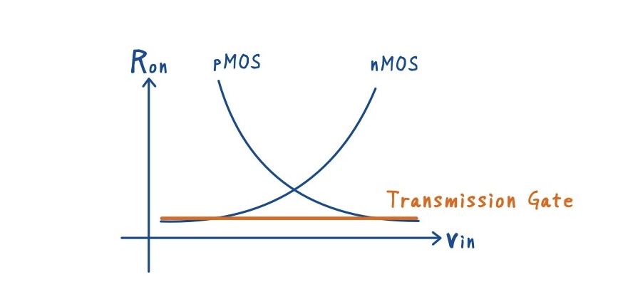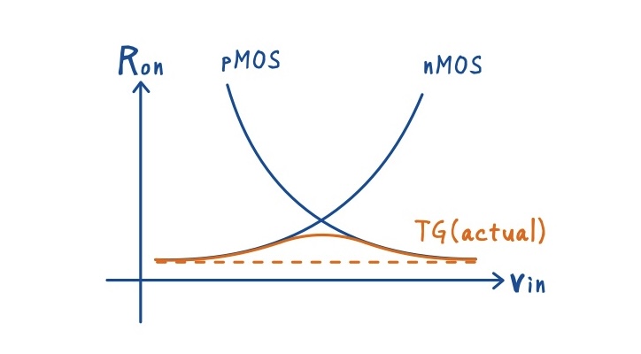 この式から分かるように,\(R_{\text{on,TG}}\) は入力電圧\(V_{\text{in}}\)に依存しない一定の値として扱うことができます.この性質により,nMOS 単体や pMOS 単体では導通が弱くなる領域を相互に補い合い,0〜VDD の広い入力レンジで安定してサンプリングできるスイッチを実現できます.