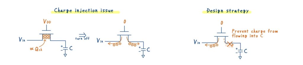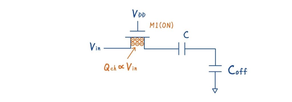 ここで,M1 が ON の間に蓄積されていたチャネル電荷を考えます.M1 のチャネル電荷は,\(Q_{\text{ch}} \propto V_{\text{in}}\)であり,入力信号に依存した量です.