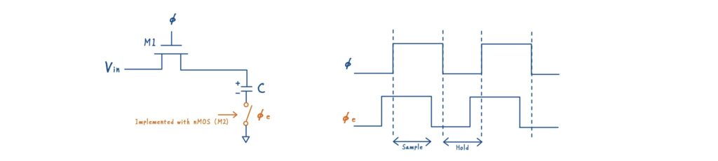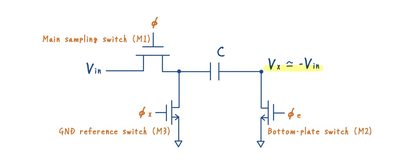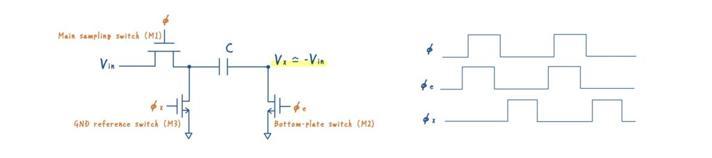 具体的には,サンプリング容量の下側(ボトムプレート)に,もう一つのスイッチ M2 を追加します.ここで最も重要なのは,スイッチの制御タイミングです.