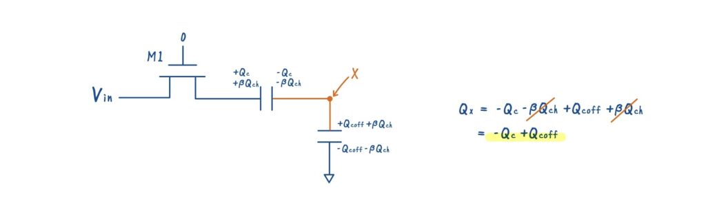 M2 を OFF にすると,完全OPENならこの電荷は下側に流れ込めませんが,\(C_{\text{off}}\) が存在するため,チャネル電荷の一部 \(\beta Q_{\text{ch}}\) が容量結合を通じて下側へ結合してしまいます.