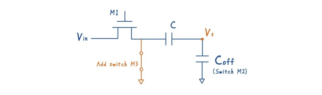 ボトムプレートサンプリングでは,理想的には M2 を OFF にした瞬間,ボトムプレートは完全に OPENになっていてほしい,という前提があります.しかし実際の MOS スイッチでは,OFF にしてもドレイン–ソース間やゲート由来のオフ容量 \(C_{\text{off}}\) が必ず残ります.