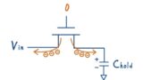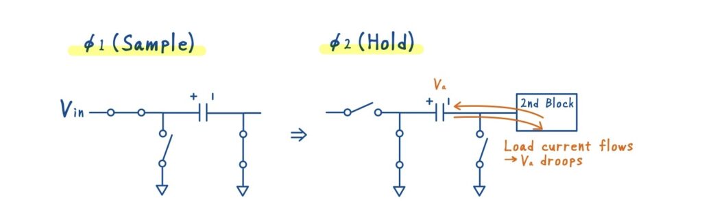 しかし,この構成には一つの暗黙の前提があります.それは,サンプルされた容量から後段回路が電流を引き出さないという前提です.