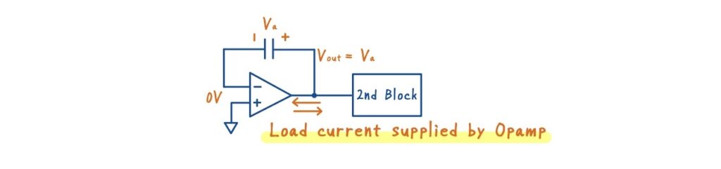 理想的には,十分に大きな出力電流を供給できるオペアンプを用いれば,後段回路が必要とする電流はすべてオペアンプが担うことができます.さらに,オペアンプに負帰還をかけることで仮想接地が成立し,容量にチャージされた電圧 \(V_a\) は,ほぼそのまま出力電圧 \(V_{\text{out}}\) として現れます.