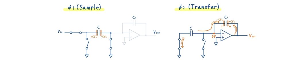 これこそがスイッチトキャパシタ回路の狙いであり,電荷はフィードバック容量 \(C_F\)へ転送(=再分配)され,その結果として出力電圧 \(V_{\text{out}}\) が形成されます.