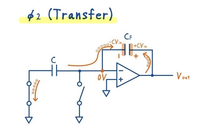 次に転送フェーズ \(\phi_2\) では,この電荷がフィードバック容量 \(C_F\) へと転送されます.
