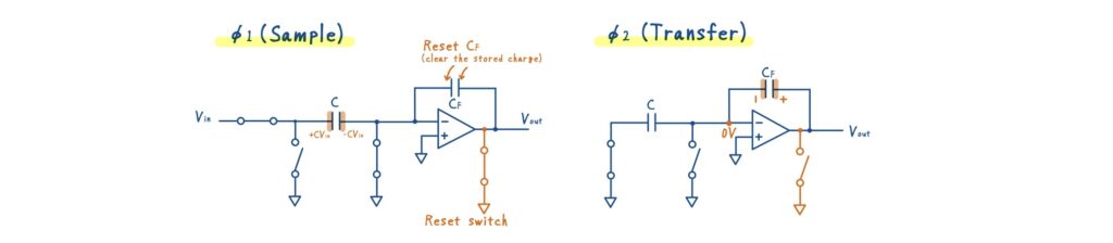 - SC の基本は,\(\phi_1\)で \(C\) に蓄えた電荷を,\(\phi_2\)で \(C_F\) へ転送して出力電圧を作ること.