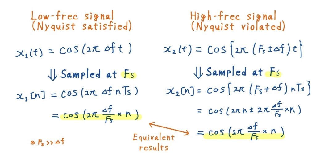 さらに,周波数を一般化して \(M \cdot F_s \pm \Delta f \)とした場合も,サンプリング後の信号は同じく \(\Delta f \)にエイリアスします.このことから,「高周波成分が低域に折り返される」というエイリアシングの本質が数式的に確認できます.