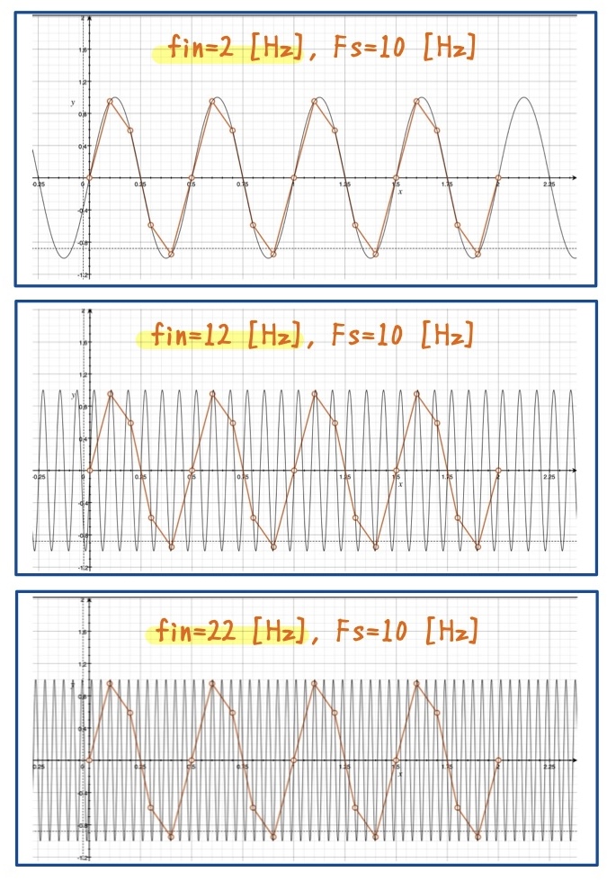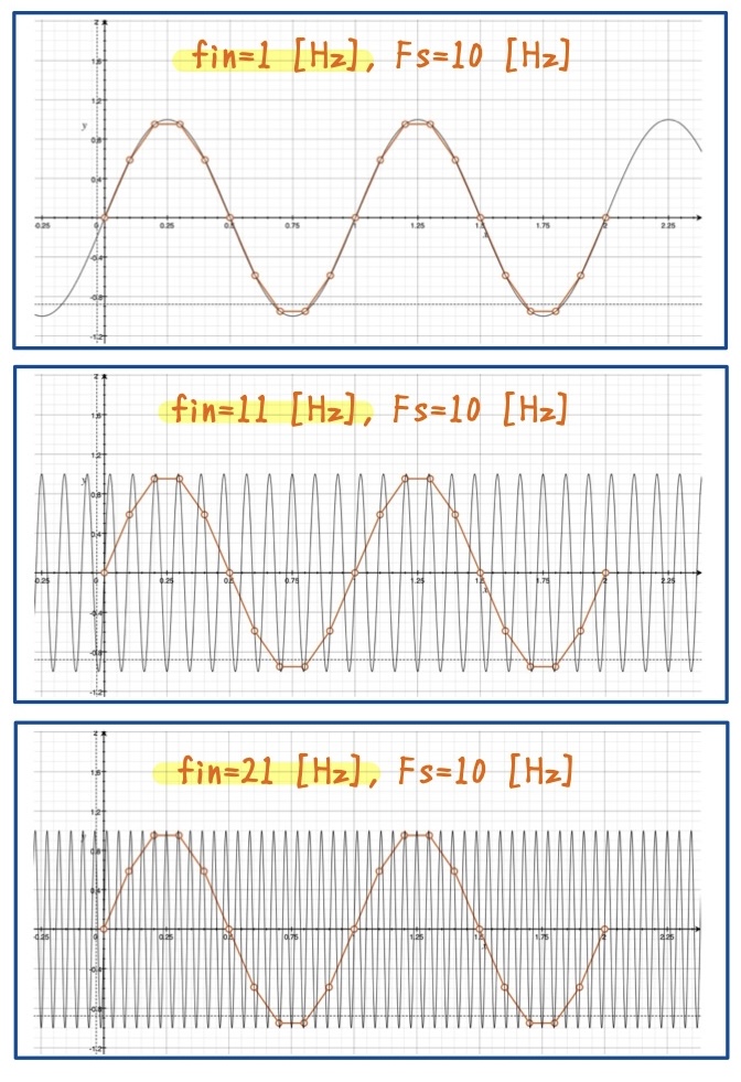 比較すると,異なる入力周波数であっても,サンプリング後の波形はいずれも同じに見えます.