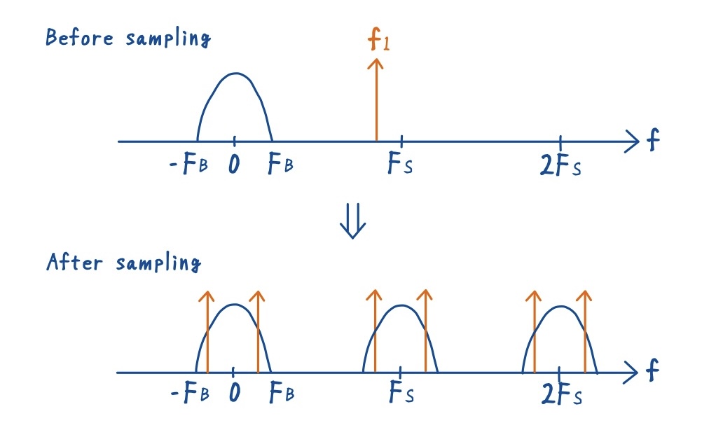 図で考えると,\([-F_B, +F_B]\) に収まる信号に対し,外側にあったノイズピーク \(f_1\) がサンプリング後には折り返されて帯域内に入り込み,周期的に繰り返されるように見えます.その結果,サンプリング前には分離していたノイズスペクトルが重なり,本来の信号に干渉して波形を歪めてしまいます.