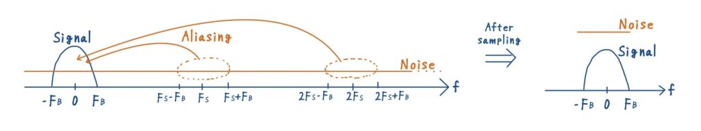 この状態でサンプリング周波数 \(F_s\) でサンプリングすると,信号スペクトルだけでなくノイズスペクトルも \(F_s\) 周期で複製されます.その結果,帯域外の広帯域ノイズが折り返されて \([-F_B,+F_B]\) に重なり込み,帯域内のノイズ床が底上げされます.サンプリング前は信号帯域と分離していたノイズが,サンプリング後には重畳してしまい,信号がノイズに埋もれてしまうことがあります.