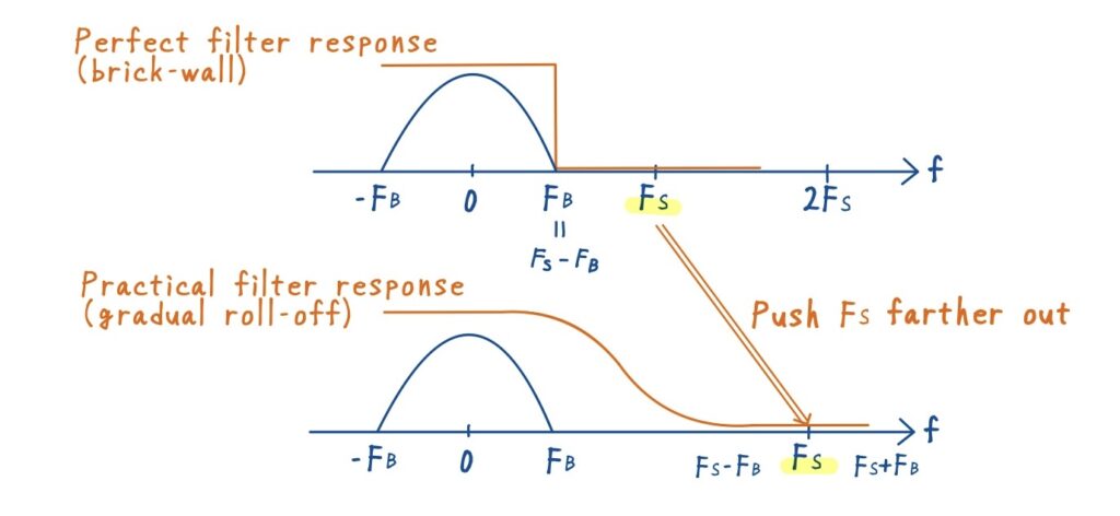 そのため,実務では設計を現実的にする工夫が必要です.ナイキスト条件 \(F_s > 2B\) を満たすだけでなく,さらに余裕を持ってサンプリング周波数 \(F_s\) を高く設定します.これによって,信号帯域 \([-F_B, +F_B]\) と折り返し成分が侵入する帯域 \([F_s – F_B,\, F_s + F_B]\) の間にガードバンドが生まれます.ガードバンドが広がることで,フィルタの遷移帯域を十分に確保でき,緩やかな減衰特性を持つ現実的なフィルタでも必要な性能を満たせるようになります.