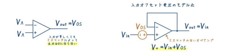 解析においては,このオフセットを等価的に \(V_{OS}\) という電圧源としてモデル化します.これは,オペアンプの入力に直列に電圧源が存在するものとして扱うことで,回路全体への影響を簡潔に表現するためのものです.ただし,実際にこのような電圧源が回路内に存在するわけではなく,あくまで解析上の等価モデルである点に注意が必要です.