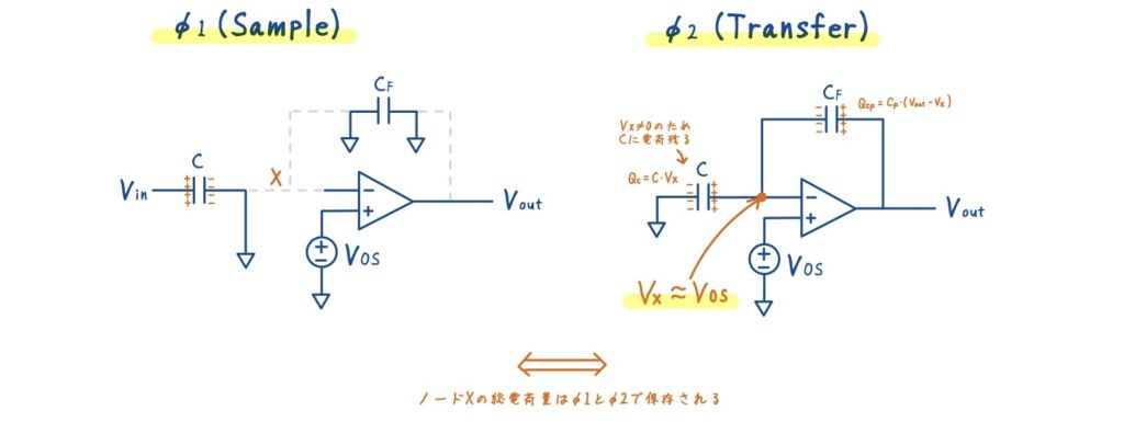 \(V_X = V_{OS}\) であるため,サンプリング容量には \(C \cdot V_{OS}\) に相当する電荷が残り,電荷転送が不完全になります.