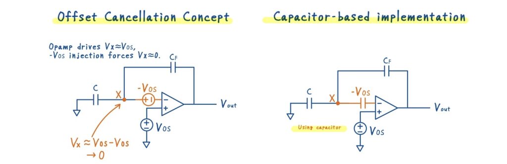 • 補正容量を用いることで,\(-V_{OS}\) を入力側に与え,オフセットを打ち消すことができる.