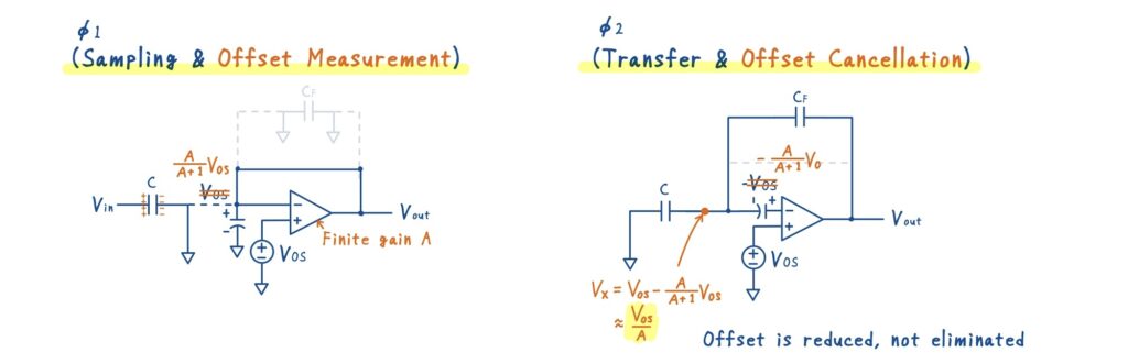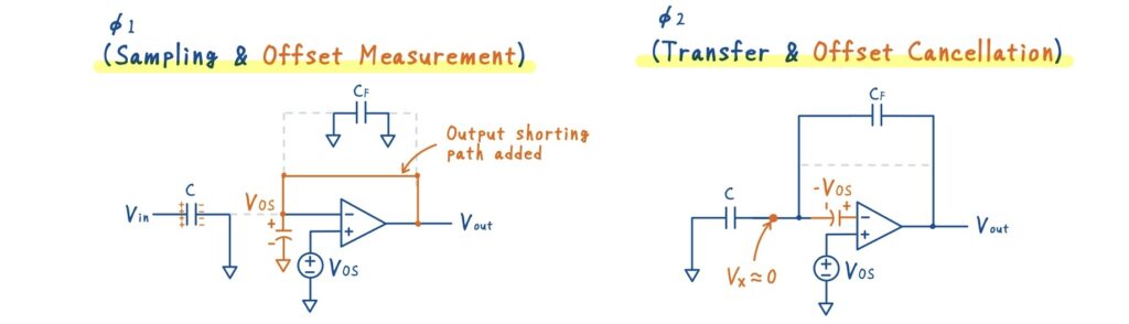 オフセットキャンセルは,2つのクロックフェーズで動作します.重要なのは,オフセットキャンセル容量に,\(\phi_1\)のフェーズで補正電圧をチャージすることです.