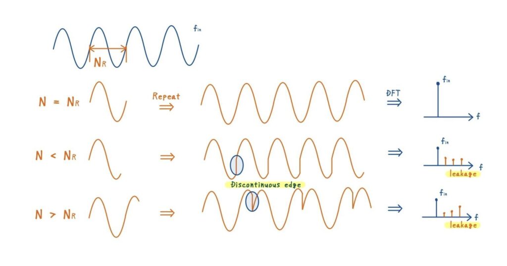 スペクトルリーケージは,前回の記事でも触れたように,信号を有限長に切り取ってDFTを行うことによる副作用です.DFTでは,有限区間の信号を周期的に繰り返すと仮定するため,切り取り方によっては区間の端点で不連続が生じる場合があります.この時間領域での不連続が,周波数領域ではスペクトルリーケージとして現れます.