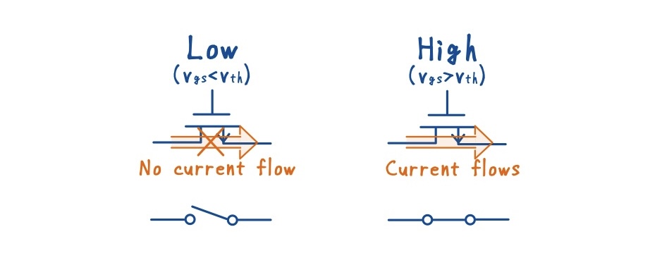- ゲート電圧 High → 電流が流れる(ON 状態)
