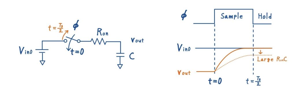 - \(R_\text{on}C \ll T_S/2\):サンプル期間内に十分に充電.