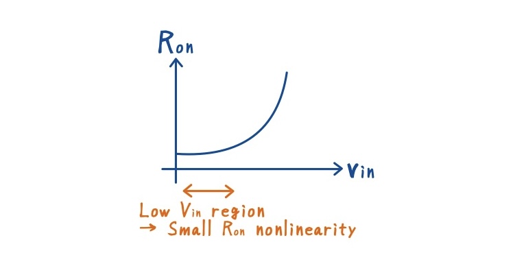入力が高くなると \(R_\text{on}\) が急増し,最終的にはスイッチがオフするため,理論上の最大振幅よりも前にスイッチが機能しなくなるという問題があります.