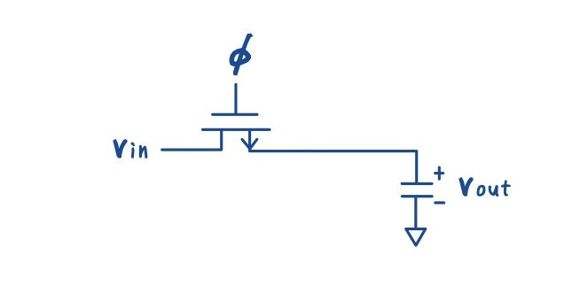 S/H 回路の構成は非常にシンプルで,スイッチとコンデンサの 2 つだけで動作します.スイッチ \(\phi\) が閉じている間は,スイッチ経路を通して電荷がコンデンサへチャージ(あるいはディスチャージ)されるため,出力電圧 \(v_\text{out}\) は入力信号 \(v_\text{in}\) に追従します(Sample).そして,スイッチ \(\phi\) が開くと電荷の経路が途切れるため,コンデンサに蓄えられた電圧がそのまま保持されます(Hold).