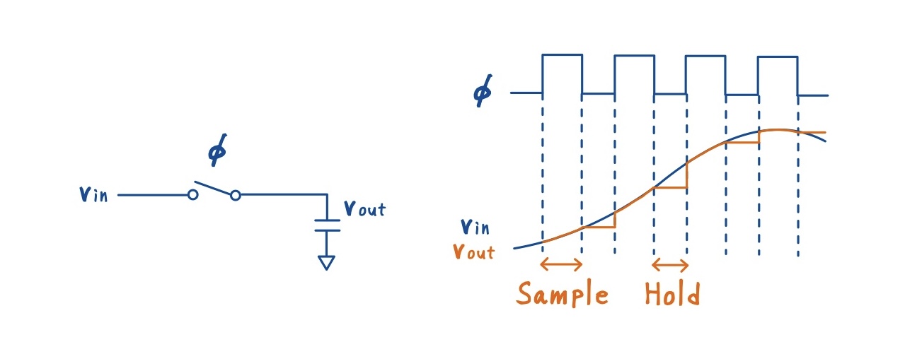 S/H 回路の構成は非常にシンプルで,スイッチとコンデンサの 2 つだけで動作します.スイッチ \(\phi\) が閉じている間は,スイッチ経路を通して電荷がコンデンサへチャージ(あるいはディスチャージ)されるため,出力電圧 \(v_\text{out}\) は入力信号 \(v_\text{in}\) に追従します(Sample).そして,スイッチ \(\phi\) が開くと電荷の経路が途切れるため,コンデンサに蓄えられた電圧がそのまま保持されます(Hold).